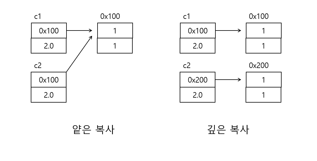 - 단순히 객체에 저장된 값을 그대로 복제하는 것