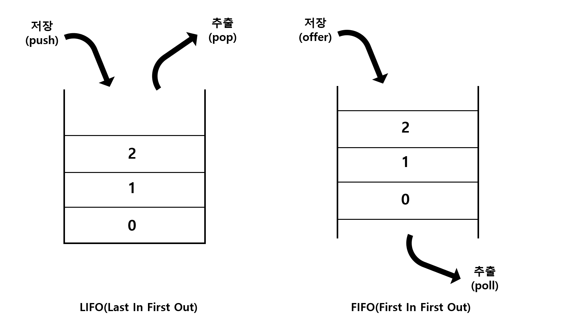 - FIFO(First In First Out) : 처음에 저장한 데이터를 가장 먼저 꺼내는 구조