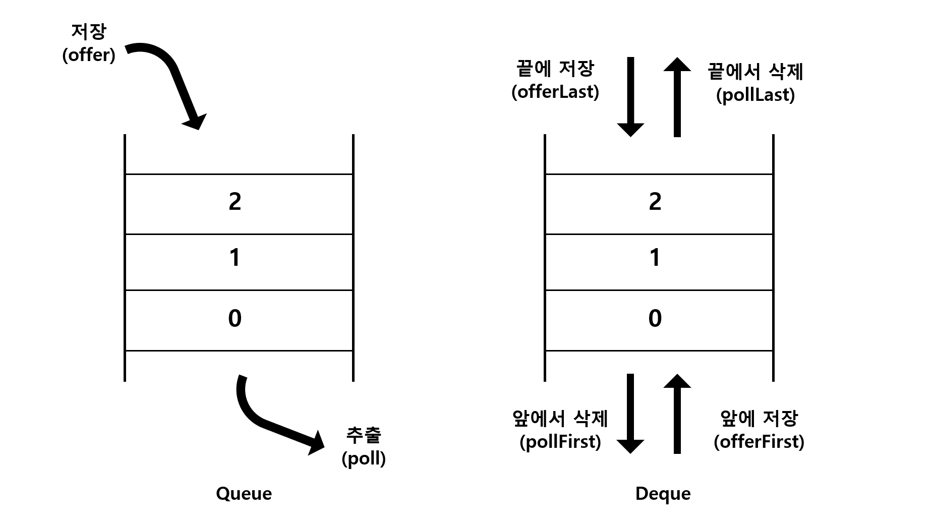 - Deque의 조상은 Queue이며, 구현체로는 ArrayDeque과 LinkedList 등이 있음